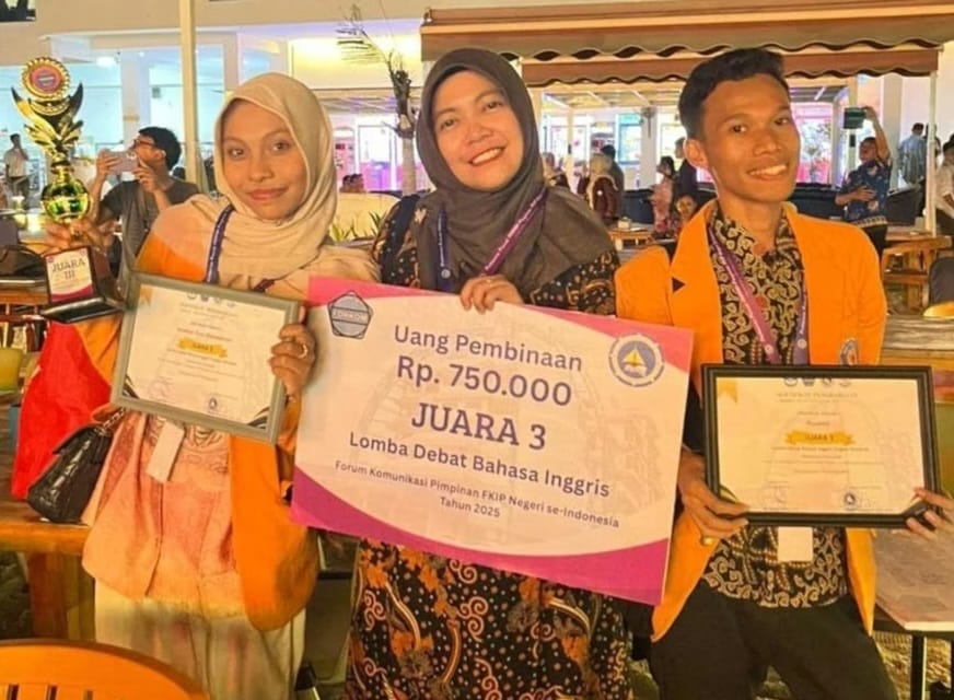 Langkah dua mahasiswa Universitas Halu Oleo (UHO) Kendari ini akhirnya tiba pada panggung nasional. Rizaldo dan Amelya Suci Ramadhani, mahasiswa Program Studi Pendidikan Bahasa Inggris FKIP UHO angkatan 2024, sukses merebut juara 3 pada Lomba Debat Bahasa Inggris FORKOM FKIP Negeri se-Indonesia 2025.
