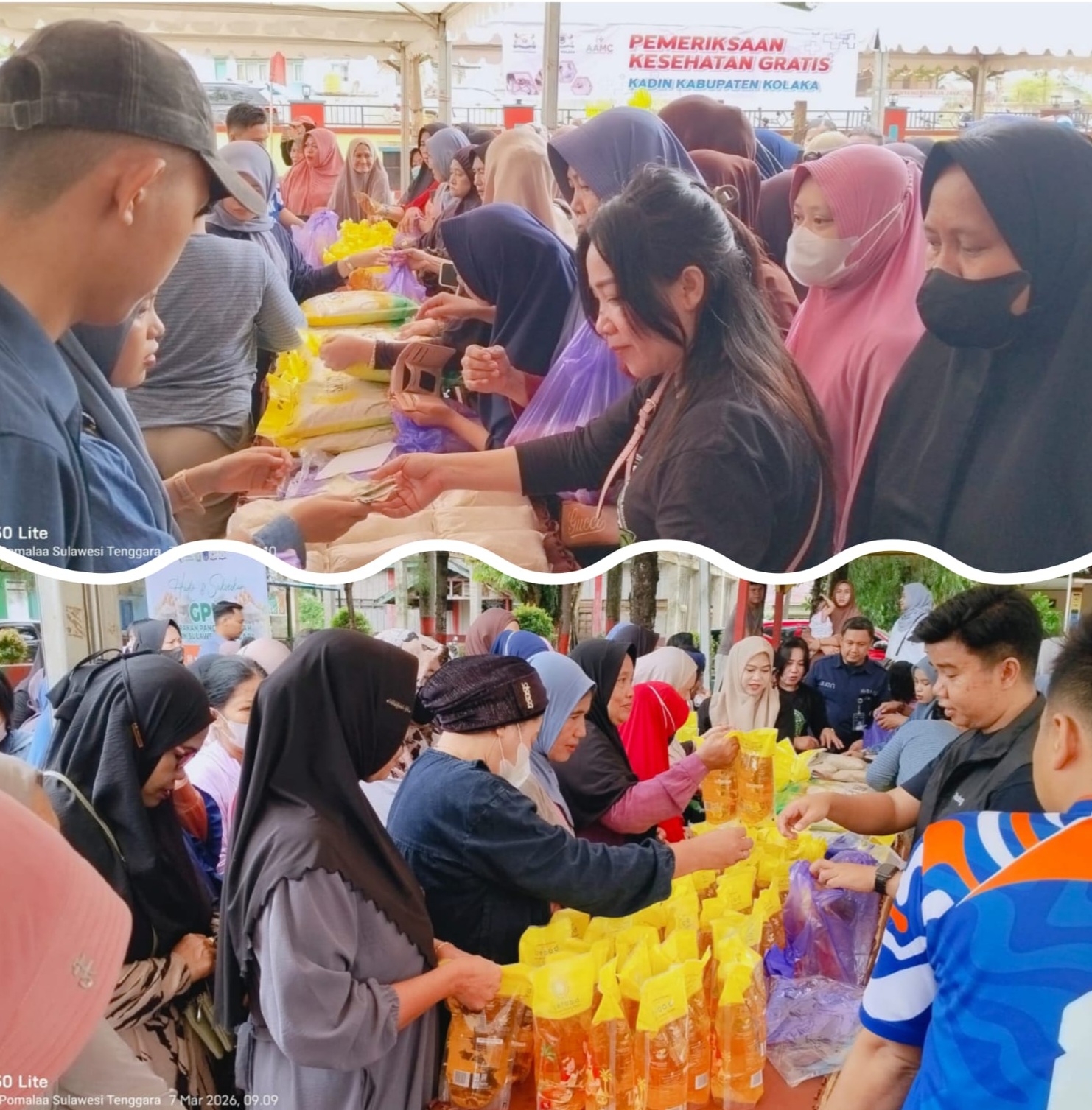 Sejak dibuka pukul 09.00 WITA, pekarangan Kantor Camat Pomalaa dipadati warga yang datang untuk membeli komoditas pangan murah yang disiapkan Kadin Sultra bersama Kadin Kolaka.